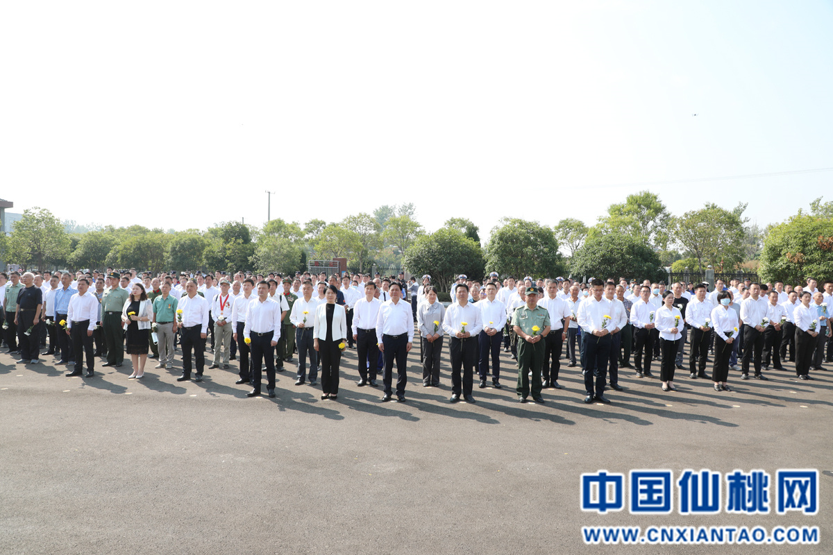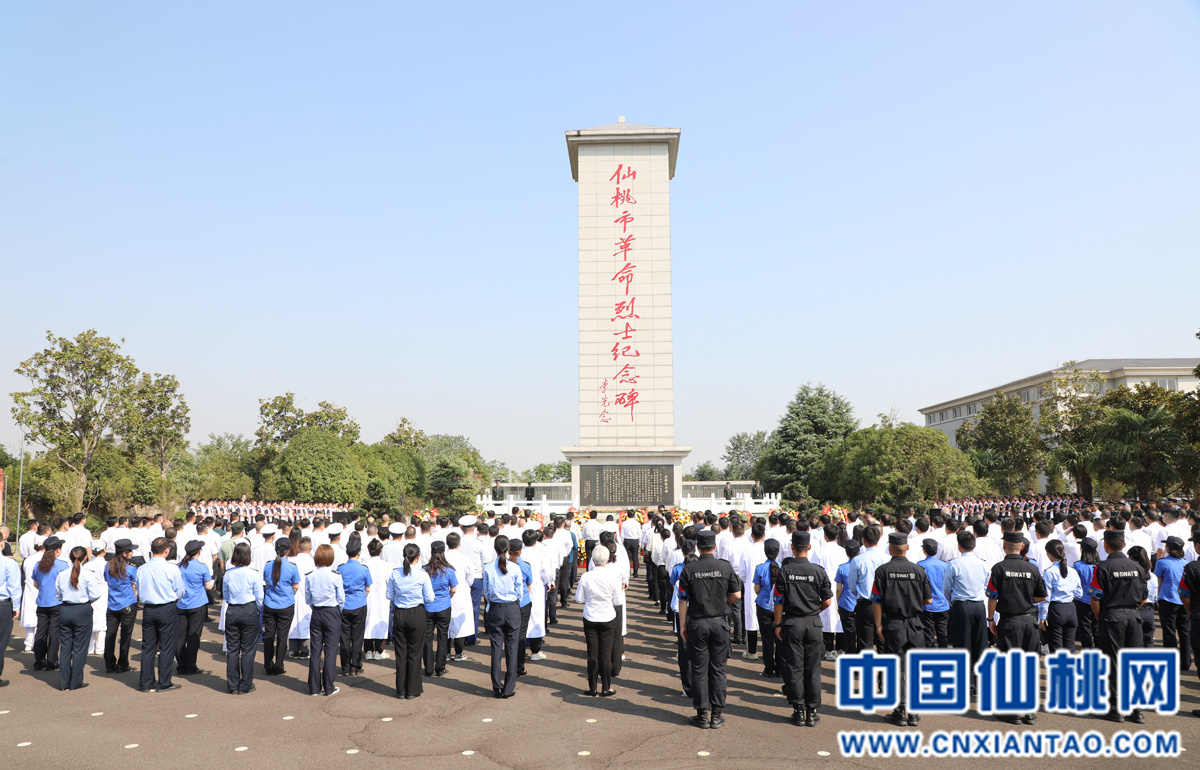 藍(lán)天白云下,菊花怒放、松柏蒼翠,烈士陵園莊嚴(yán)肅穆。廣場上,由已故國家主席李先念題寫碑名的“仙桃市革命烈士紀(jì)念碑”巍然矗立,近500名干部群眾代表列隊肅立。他們中有年過七旬的老戰(zhàn)士、老同志,有朝氣蓬勃的少年兒童,有身穿制服的職工代表,還有各行各業(yè)的先進(jìn)人物。