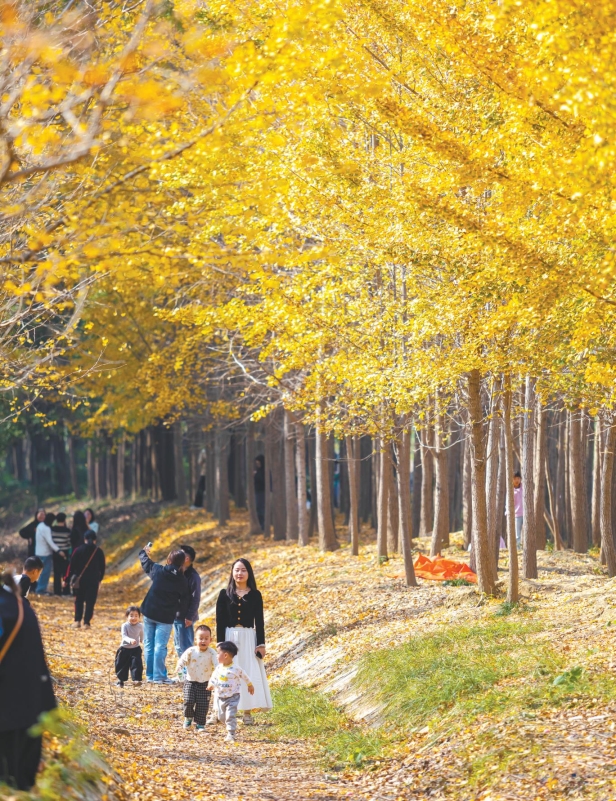 層林盡染,滿目流金,城東桃花嶺大道銀杏林成為市民郊游的好去處。圖為11月15日,市民在銀杏林里拍照定格秋日美景,孩童在落葉上歡快奔跑,歡聲笑語與秋意交織,繪就一幅人與自然相融的生動畫卷。攝影記者鄭恒