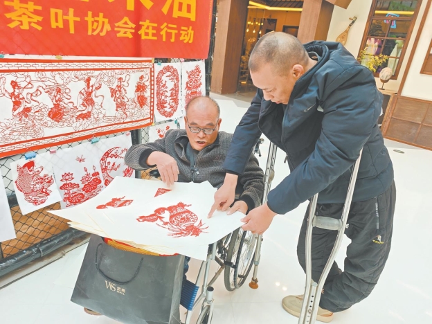 剪刀翻飛、筆墨揮灑、茶香裊裊。在吾悅廣場活動現(xiàn)場,30多位殘疾人齊聚一堂,展示非遺手工作品,即興揮毫創(chuàng)作,引得往來市民駐足觀賞、頻頻稱贊。