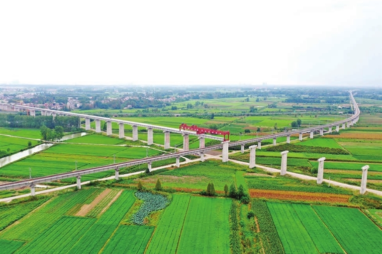 2019年8月,T梁吊裝行進至江漢平原貨運鐵路交匯處